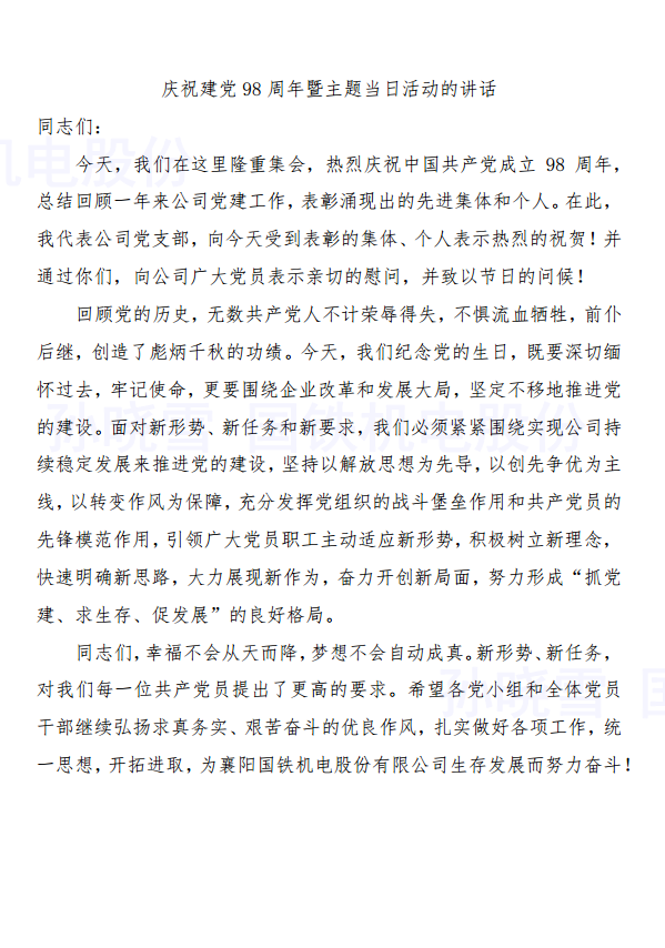 今年是建黨98周年。7月1日,襄陽(yáng)國(guó)鐵機(jī)電股份有限公司以傳承紅色基因、弘揚(yáng)革命精神展開了紀(jì)念活動(dòng)。